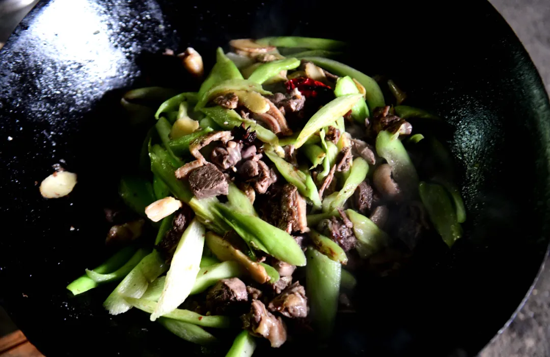 一刻钟后,打开锅盖,一股醇厚的香味扑面而来。此时将提前切好的芋苗段倒入锅中,与鸭肉一同翻炒均匀,倒入酱油,再次盖上锅盖焖煮。芋苗是秋日里的应季食材,吸满鸭肉的汤汁后,口感软糯香甜,还能中和鸭肉的油腻。待芋苗焖软后,将调好的鸭酱倒入锅中,中火快速翻炒,让每一块鸭肉、每一段芋苗都均匀裹上酱汁。酱汁的酸香与鸭肉的鲜香融合,香味飘出厨房,引得来客围着火塘频频探头,忍不住询问:“啥时候能开吃?”