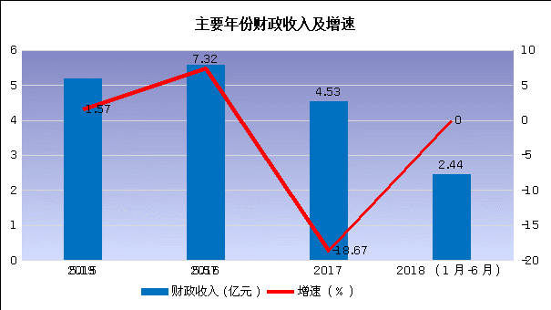 3.财政收入。2017年,全县财政收入4.53亿元,前两年财政收入年均增长-6.95%,低于《纲要》目标13.95个百分点。主要原因是2017年我县受桂三高速公路项目一次性税收的影响,造成2017年财政收入同比减收1.04亿元,下降18.68%。