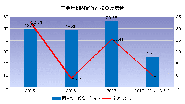 4.固定资产投资。2017年全县固定资产投资56.39亿元,同比增长15.42%。“十三五”前两年,全县累计完成固定资产投资105.25亿元,年均增长18.23%,高《纲要》目标5.23个百分点。