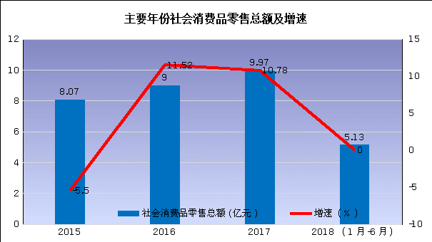7.社会消费。2017年全县社会消费品零售总额9.97亿元,“十三五”前两年年均增长10.65%,高于“十二五”时期0.15个百分点,低于《纲要》目标1.35个百分点。