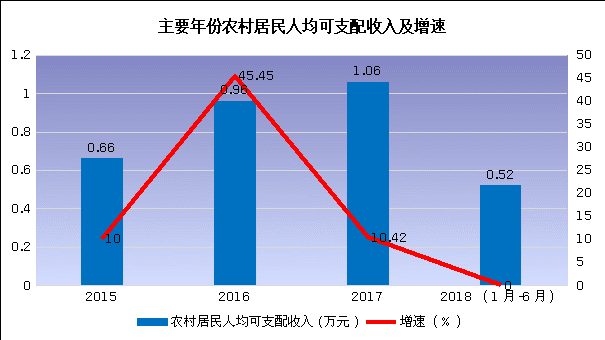 2.农村居民人均纯收入。2017年全县农村居民人均可支配收入达到10572元,同比增长10.4%,“十三五”前两年年均增长10.35%,高于《纲要》目标14.21个百分点。2018年上半年初步统计数为5190元,农民生活水平大幅提高。