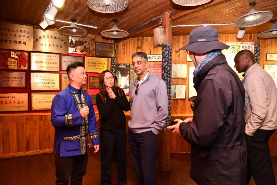 与此同时,来自全球多个国家的外宾代表团循着龙脊梯田的农耕脉络,开展沉浸式文化考察与交流。外宾一行走进长发科技馆、黄洛瑶寨长发展演馆,近距离感受红瑶 “长发文化” 的独特魅力与红瑶刺绣的精湛工艺,通过民俗展演、茶点品鉴等互动体验,深度领略龙胜各族人民与自然和谐共生的生活智慧。在平安壮寨梯田,层层叠叠的田垄景观与 “村民变股东” 的合作发展模式,让外宾直观感受我国农业文化遗产活态保护的实践成效;在龙脊茶文化体验环节,外宾亲身参与采茶制茶流程,体验文旅融合的生动场景,对我国将农耕遗产保护与乡村旅游、农民增收有机结合的创新路径给予高度评价。联合国粮农组织驻华代表表示,中国在农业文化遗产保护领域的实践走在世界前列,龙脊梯田等遗产地的发展模式为全球提供了 “保护与发展并重、传统与现代交融” 的可复制经验,为应对全球气候变化、保障粮食安全、促进乡村可持续发展贡献了中国智慧。
