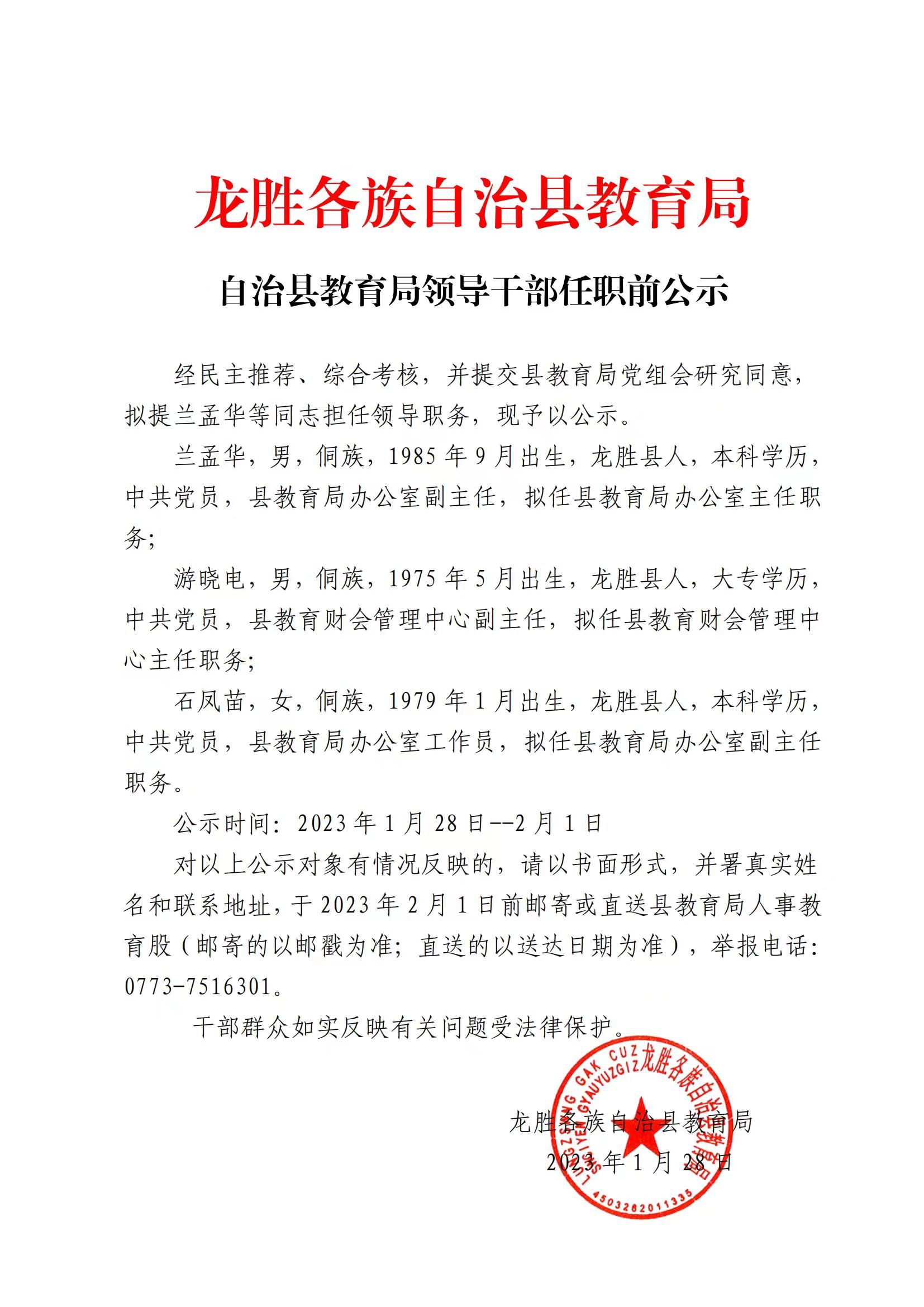 龙胜各族自治县教育局领导干部任职前公示