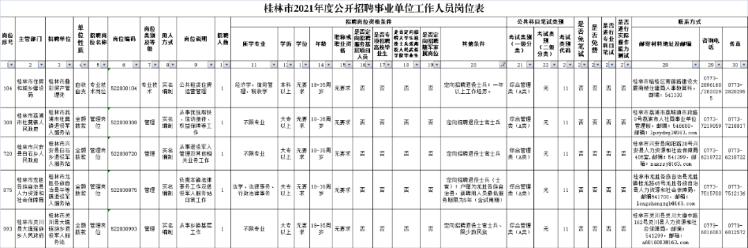 桂林市2021年度事业单位公开考试招聘人员工作已开展,全市共1010个职位计划招聘1198人,其中龙胜计划招聘89人,龙胜籍贯退伍军人可以报考的5个,网上报名时间为2021年4月6日8:30—4月12日17:00。