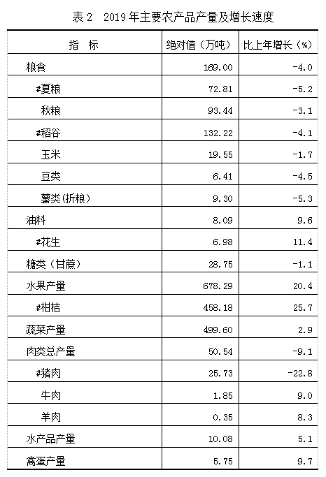 全年肉类总产量50.54万吨,比上年下降9.1%;生猪出栏342.50万头,下降22.4%;家禽出栏1.36亿羽,增长15.2%;水产品产量10.08万吨,增长5.1%。