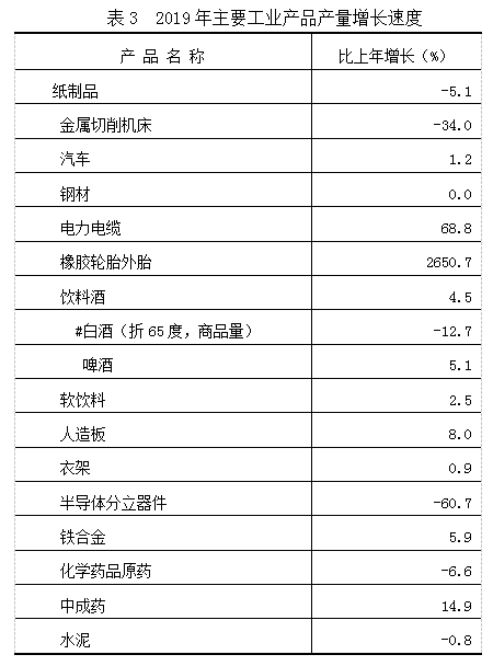全部工业总产值比上年增长1.8%,其中规模以上工业总产值增长2.0%。全部工业增加值比上年增长5.5%,其中规模以上工业增加值增长6.4%。在规模以上工业增加值中,分经济类型看,国有企业增长16.7%,集体企业增长14.0%,股份制企业增长5.2%,外商及港澳台商投资企业增长30.6%;分门类看,采矿业增长6.2%,制造业增长4.3%,电力、燃气及水的生产和供应业增长19.2%;从产业结构看,高技术行业增长4.0%,高耗能行业增长2.5%。