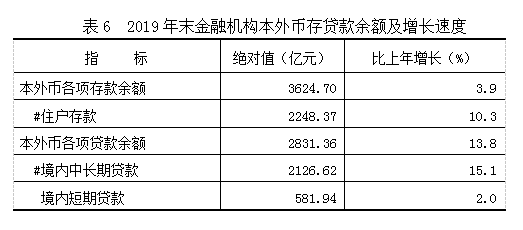 年末金融机构本外币存款余额3624.70亿元,增长3.9%。其中人民币各项存款余额3603.49亿元,本外币贷款余额2831.36亿元,增长13.8%。其中人民币各项贷款余额2829.19亿元。