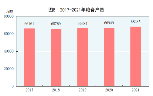 全年粮食产量68285万吨,比上年增加1336万吨,增产2.0%。其中,夏粮产量14596万吨,增产2.2%;早稻产量2802万吨,增产2.7%;秋粮产量50888万吨,增产1.9%。全年谷物产量63276万吨,比上年增产2.6%。其中,稻谷产量21284万吨,增产0.5%;小麦产量13695万吨,增产2.0%;玉米产量27255万吨,增产4.6%。