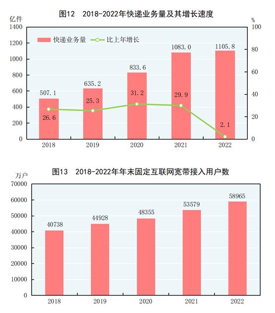 全年完成邮政行业业务总量[27]14317亿元,比上年增长4.5%。邮政业全年完成邮政函件业务9.4亿件,包裹业务0.2亿件,快递业务量1105.8亿件,快递业务收入10567亿元。全年完成电信业务总量[28]17498亿元,比上年增长21.3%。年末移动电话基站数[29]1083万个,其中4G基站603万个,5G基站231万个。全国电话用户总数186286万户,其中移动电话用户168344万户。移动电话普及率为119.2部/百人。固定互联网宽带接入用户[30]58965万户,比上年末增加5386万户,其中100M速率及以上的宽带接入用户[31]55380万户,增加5513万户。蜂窝物联网终端用户[32]18.45亿户,增加4.47亿户。互联网上网人数10.67亿人,其中手机上网人数[33]10.65亿人。互联网普及率为75.6%,其中农村地区互联网普及率为61.9%。全年移动互联网用户接入流量2618亿GB,比上年增长18.1%。全年软件和信息技术服务业[34]完成软件业务收入108126亿元,按可比口径计算,比上年增长11.2%。