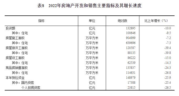 全年房地产开发投资132895亿元,比上年下降10.0%。其中住宅投资100646亿元,下降9.5%;办公楼投资5291亿元,下降11.4%;商业营业用房投资10647亿元,下降14.4%。年末商品房待售面积56366万平方米,比上年末增加5343万平方米,其中商品住宅待售面积26947万平方米,增加4186万平方米。