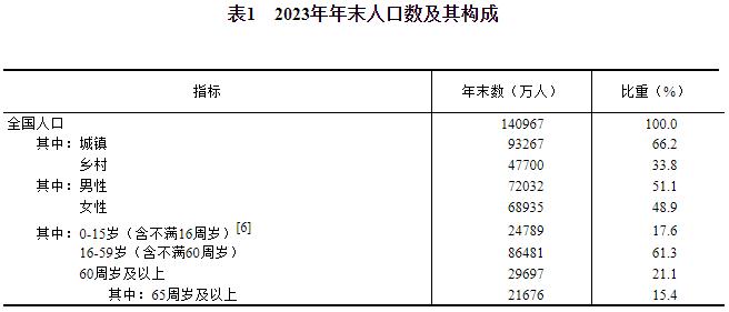 [6]2023年年末,0-14岁(含不满15周岁)人口为23063万人,15-59岁(含不满60周岁)人口为88207万人。
