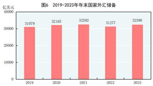 年末国家外汇储备32380亿美元,比上年末增加1103亿美元。全年人民币平均汇率为1美元兑7.0467元人民币,比上年贬值4.5%。