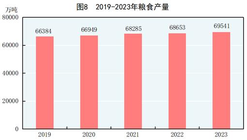 全年粮食产量69541万吨,比上年增加888万吨,增产1.3%。其中,夏粮产量14615万吨,减产0.8%;早稻产量2834万吨,增产0.8%;秋粮产量52092万吨,增产1.9%。谷物产量64143万吨,比上年增产1.3%。其中,稻谷产量20660万吨,减产0.9%;小麦产量13659万吨,减产0.8%;玉米产量28884万吨,增产4.2%。大豆产量2084万吨,增产2.8%。