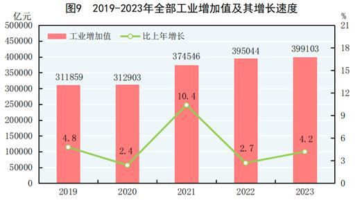 全年全部工业增加值399103亿元,比上年增长4.2%。规模以上工业增加值增长4.6%。在规模以上工业中,分经济类型看,国有控股企业增加值增长5.0%;股份制企业增长5.3%,外商及港澳台商投资企业增长1.4%;私营企业增长3.1%。分门类看,采矿业增长2.3%,制造业增长5.0%,电力、热力、燃气及水生产和供应业增长4.3%。