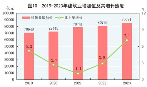 全年建筑业增加值85691亿元,比上年增长7.1%。全国具有资质等级的总承包和专业承包建筑业企业利润8326亿元,比上年增长[27]0.2%,其中国有控股企业4019亿元,增长4.3%。