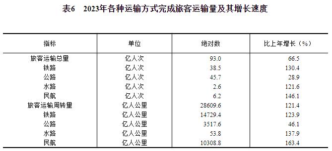 全年旅客运输总量93亿人次,比上年增长66.5%。旅客运输周转量28610亿人公里,增长121.4%。