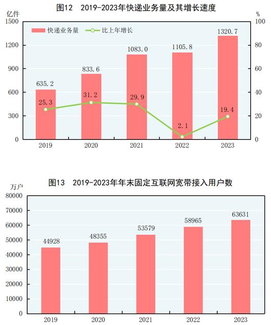 全年完成邮政行业寄递业务总量[29]1625亿件,比上年增长16.8%。邮政业完成邮政函件业务9.7亿件,包裹业务0.2亿件,快递业务量1320.7亿件,快递业务收入12074亿元。全年完成电信业务总量[30]18327亿元,比上年增长16.8%。年末移动电话基站数[31]1162万个,其中4G基站629万个,5G基站338万个。全国电话用户总数189992万户,其中移动电话用户172660万户。移动电话普及率为122.5部/百人。固定互联网宽带接入用户[32]63631万户,比上年末增加4666万户,其中100M速率及以上的宽带接入用户[33]60136万户,增加4756万户。蜂窝物联网终端用户[34]23.32亿户,增加4.88亿户。互联网上网人数10.92亿人,其中手机上网人数10.91亿人。互联网普及率为77.5%,其中农村地区互联网普及率为66.5%。全年移动互联网用户接入流量3015亿GB,比上年增长15.2%。软件和信息技术服务业[35]完成软件业务收入123258亿元,比上年增长13.4%。