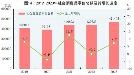 全年社会消费品零售总额471495亿元,比上年增长7.2%。按经营地分,城镇消费品零售额407490亿元,增长7.1%;乡村消费品零售额64005亿元,增长8.0%。按消费类型分,商品零售额418605亿元,增长5.8%;餐饮收入52890亿元,增长20.4%。服务零售额[36]比上年增长20.0%。