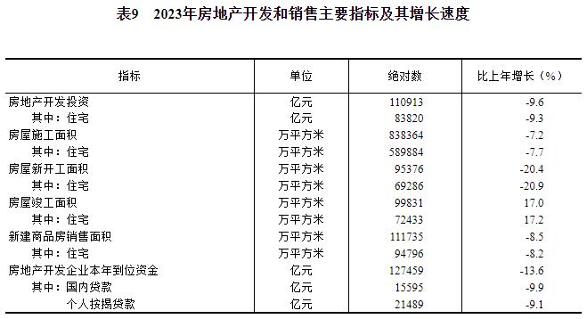 全年房地产开发投资110913亿元,比上年下降[43]9.6%。其中住宅投资83820亿元,下降9.3%;办公楼投资4531亿元,下降9.4%;商业营业用房投资8055亿元,下降16.9%。全年新建商品房销售面积[44]111735万平方米。二手房交易网签面积[45]70882万平方米。年末新建商品房待售面积67295万平方米,其中商品住宅待售面积33119万平方米。