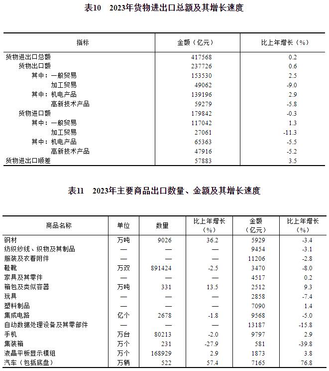 全年货物进出口总额417568亿元,比上年增长0.2%。其中,出口237726亿元,增长0.6%;进口179842亿元,下降0.3%。货物进出口顺差57883亿元,比上年增加1938亿元。对共建“一带一路”[46]国家进出口额194719亿元,比上年增长2.8%。其中,出口107314亿元,增长6.9%;进口87405亿元,下降1.9%。对《区域全面经济伙伴关系协定》(RCEP)其他成员国[47]进出口额125967亿元,比上年下降1.6%。民营企业进出口额223601亿元,比上年增长6.3%,占进出口总额比重为53.5%。