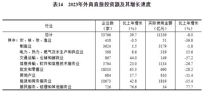 全年外商直接投资新设立企业53766家,比上年增长39.7%。实际使用外商直接投资额11339亿元,下降8.0%,折1633亿美元,下降13.7%。其中,共建“一带一路”国家对华直接投资(含通过部分自由港对华投资)新设立企业13649家,增长82.7%;对华直接投资额1221亿元,下降11.4%,折176亿美元,下降16.7%。高技术产业实际使用外资额4233亿元,下降4.9%,折610亿美元,下降10.8%。