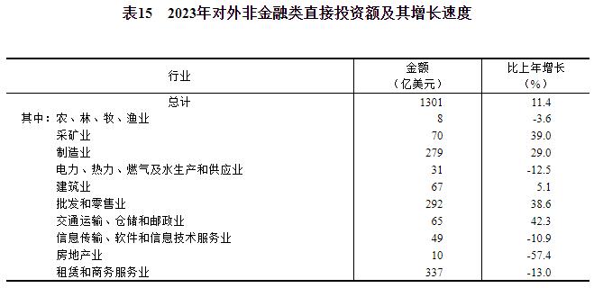 全年对外非金融类直接投资额9170亿元,比上年增长16.7%,折1301亿美元,增长11.4%。其中,对共建“一带一路”国家非金融类直接投资额2241亿元,增长28.4%,折318亿美元,增长22.6%。