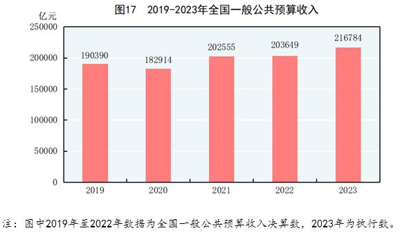 全年全国一般公共预算收入216784亿元,比上年增长6.4%;其中税收收入181129亿元,增长8.7%。全国一般公共预算支出274574亿元,比上年增长5.4%。全年新增减税降费及退税缓费超2.2万亿元。