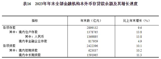 全年社会融资规模增量[48]35.6万亿元,按可比口径计算,比上年多3.4万亿元。年末社会融资规模存量[49]378.1万亿元,按可比口径计算,比上年末增长9.5%,其中对实体经济发放的人民币贷款余额235.5万亿元,增长10.4%。年末全部金融机构本外币各项存款余额289.9万亿元,比年初增加25.4万亿元,其中人民币各项存款余额284.3万亿元,增加25.7万亿元。全部金融机构本外币各项贷款余额242.2万亿元,增加22.2万亿元,其中人民币各项贷款余额237.6万亿元,增加22.7万亿元。人民币普惠小微贷款[50]余额29.4万亿元,增加5.6万亿元。人民币制造业中长期贷款余额12.2万亿元,增加3.1万亿元。