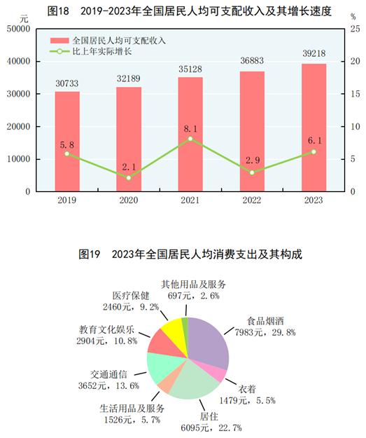 全年全国居民人均可支配收入39218元,比上年增长6.3%,扣除价格因素,实际增长6.1%。全国居民人均可支配收入中位数[56]33036元,增长5.3%。按常住地分,城镇居民人均可支配收入51821元,比上年增长5.1%,扣除价格因素,实际增长4.8%。城镇居民人均可支配收入中位数47122元,增长4.4%。农村居民人均可支配收入21691元,比上年增长7.7%,扣除价格因素,实际增长7.6%。农村居民人均可支配收入中位数18748元,增长5.7%。城乡居民人均可支配收入比值为2.39,比上年缩小0.06。按全国居民五等份收入分组[57],低收入组人均可支配收入9215元,中间偏下收入组人均可支配收入20442元,中间收入组人均可支配收入32195元,中间偏上收入组人均可支配收入50220元,高收入组人均可支配收入95055元。全国农民工人均月收入4780元,比上年增长3.6%。脱贫县[58]农村居民人均可支配收入16396元,比上年增长8.5%,扣除价格因素,实际增长8.4%。
