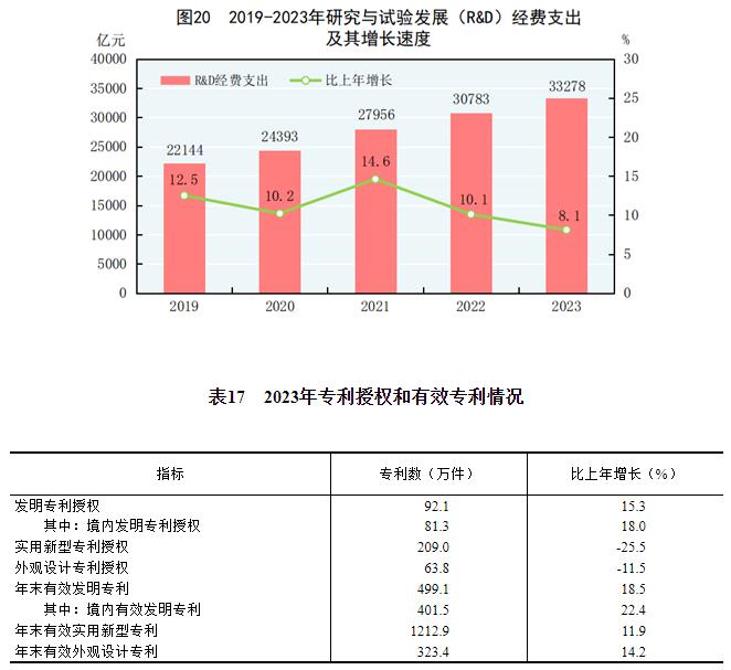 全年研究与试验发展(R&D)经费支出33278亿元,比上年增长8.1%,与国内生产总值之比为2.64%,其中基础研究经费2212亿元,比上年增长9.3%,占R&D经费支出比重为6.65%。国家自然科学基金共资助5.25万个项目。截至年末,纳入新序列管理的国家工程研究中心207个,国家企业技术中心1798家。国家科技成果转化引导基金累计设立36只子基金,资金总规模624亿元。国家级科技企业孵化器[64]1606家,国家备案众创空间[65]2376家。全年授予发明专利权92.1万件,比上年增长15.3%。PCT专利申请受理量[66]7.4万件。截至年末,有效发明专利499.1万件,比上年末增长18.5%。每万人口高价值发明专利拥有量[67]11.8件。全年商标注册438.3万件,比上年下降29.0%。全年共签订技术合同95万项,技术合同成交金额61476亿元,比上年增长28.6%。我国公民具备科学素质[68]的比例达到14.14%。
