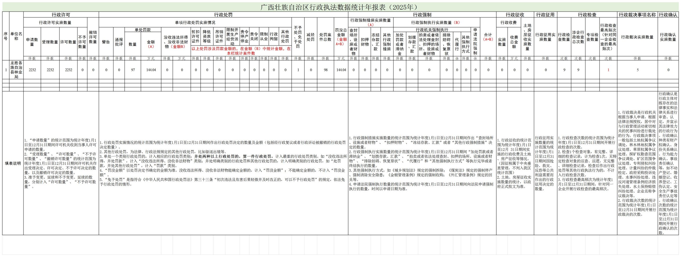 龙胜各族自治县林业局行政执法数据统计年报表(2025年)