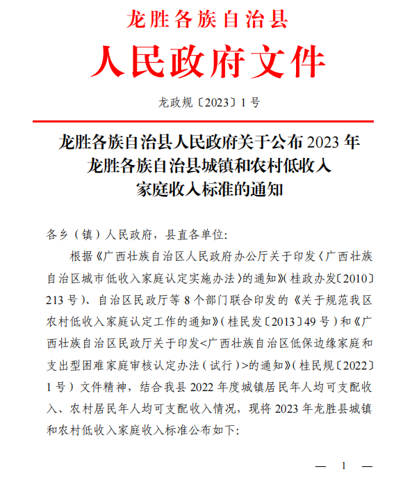(龙政规〔2023〕1号网传51号)龙胜各族自治县人民政府关于公布2023年龙胜各族自治县城镇和农村低收入家庭收入标准的通知.pdf