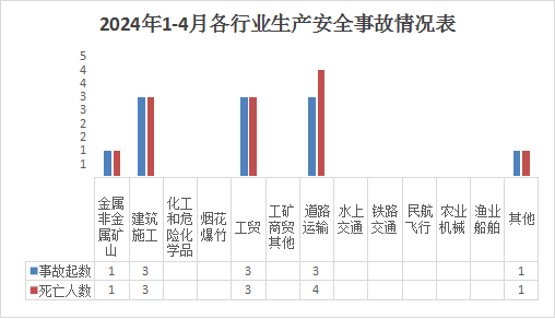 4月份接报生产安全事故起数3起、死亡3人、无受伤人数。
