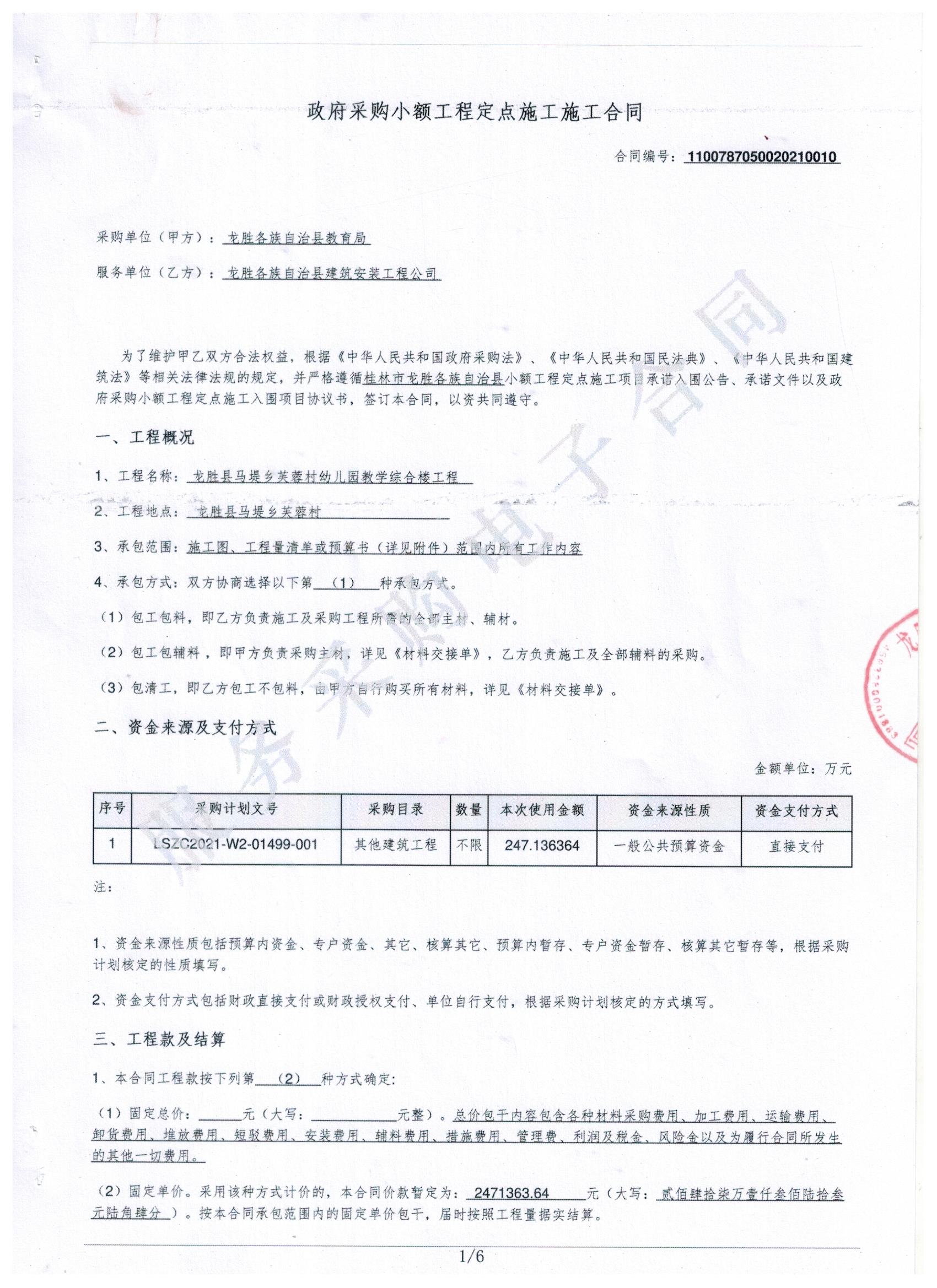 三、采购项目名称: 龙胜各族自治县教育局小额工程定点施工订购单