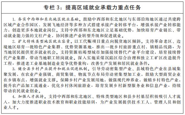 推动区域就业协调发展。支持东部地区发挥创新要素集聚优势,率先实现产业升级,开拓高质量就业新领域,培育高质量就业增长极。加快完善中西部和东北地区基础设施,提升产业集聚区公共服务效能,引导产业向中西部和东北地区有序梯度转移,推动就业机会向中西部和东北地区扩散。支持中西部和东北地区根据国家战略导向和发展重点,对接先进生产要素和创新资源,发展特色优势产业,改造提升传统产业,积极布局新兴产业,厚植就业创业沃土。