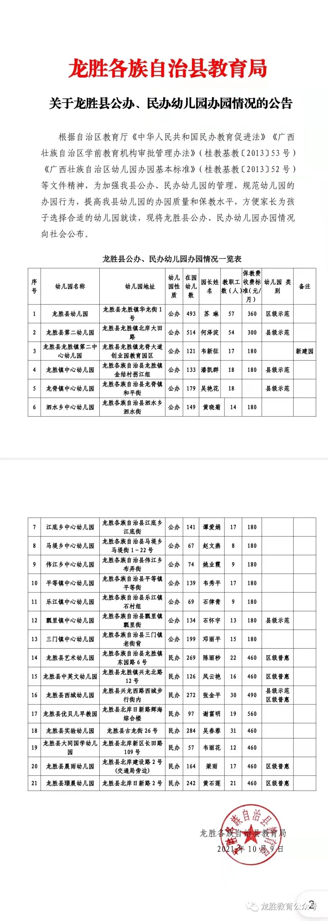 龙胜各族自治县教育局关于龙胜县公办、民办幼儿园办园情况的公告