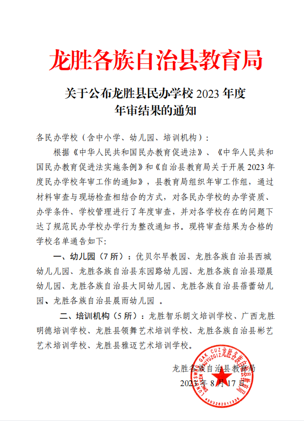 关于公布龙胜县民办学校2023年度年审结果的通知