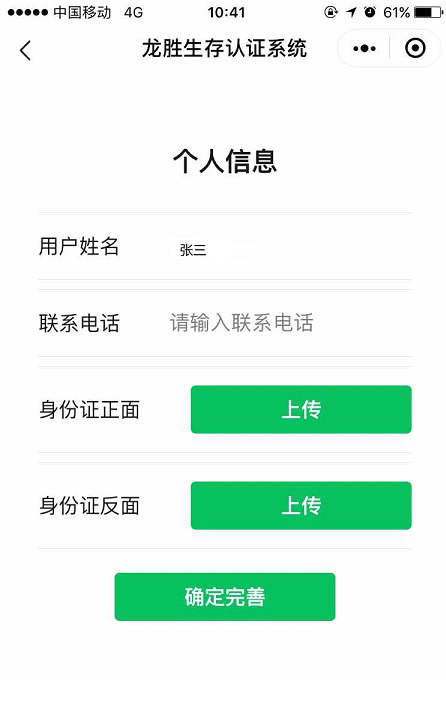 3. 登录成功后自动跳转到完善用户个人信息页面,用户填写手机号,上传身份证照片后,点击确认。