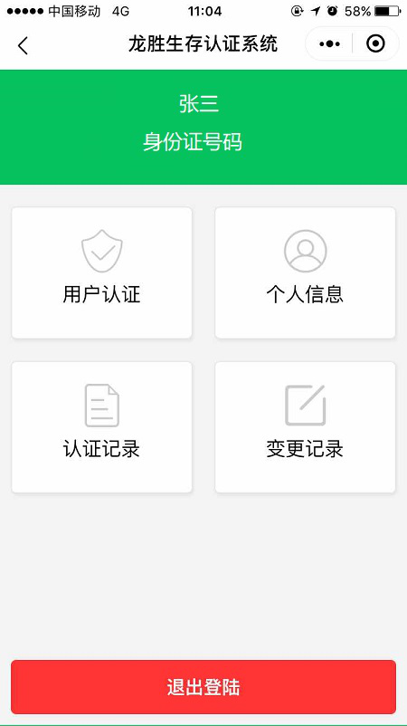 (1)用户认证。用户认证分为两种(可选择),一种为拍照认证,一种为快速认证(快速认证需要用户身份证开通过微信支付才可以使用),用户认证完成之后,可在认证记录查看,所有已认证得记录。