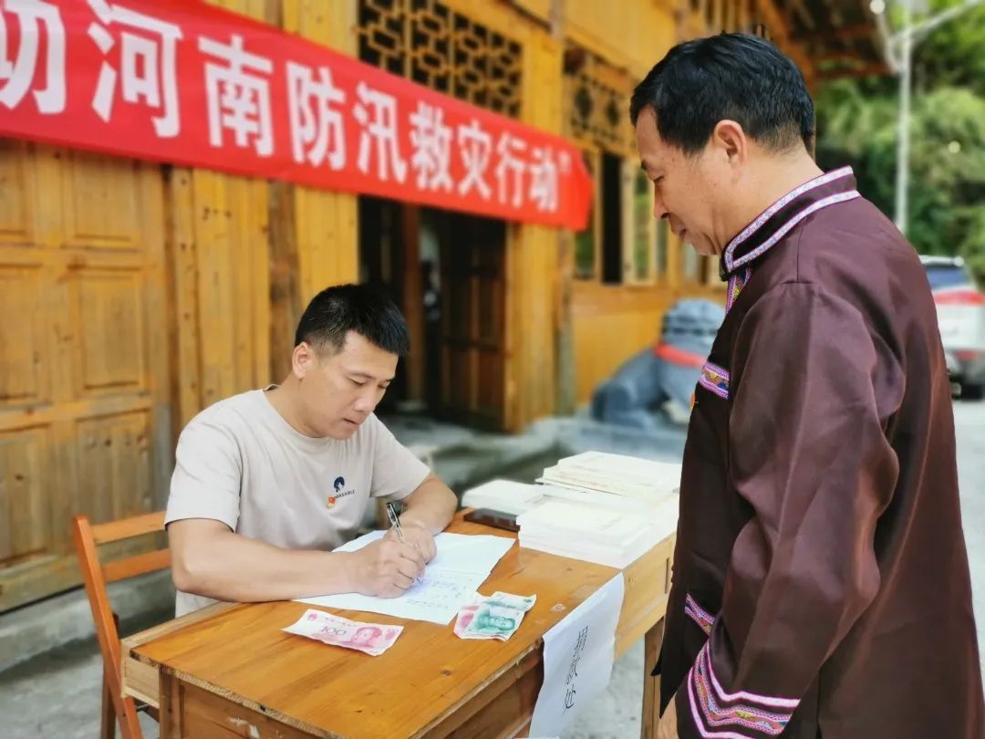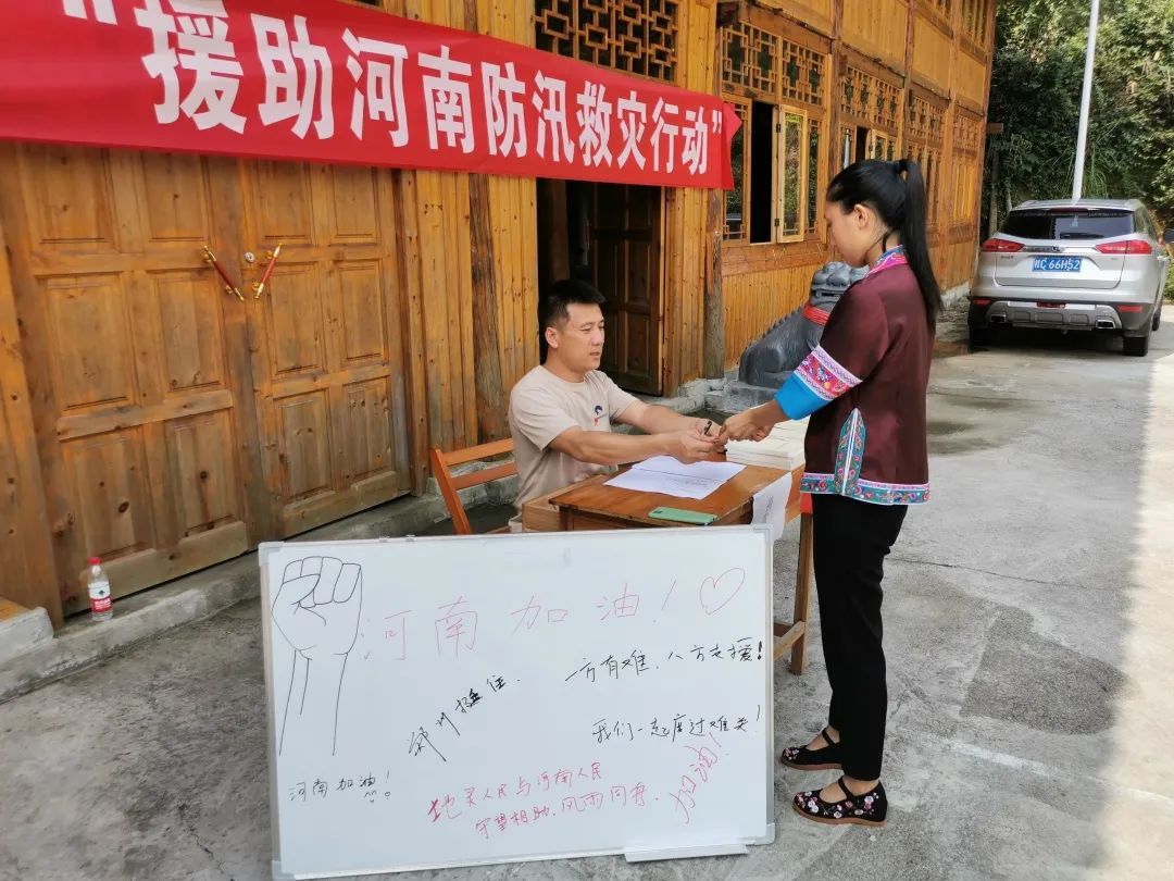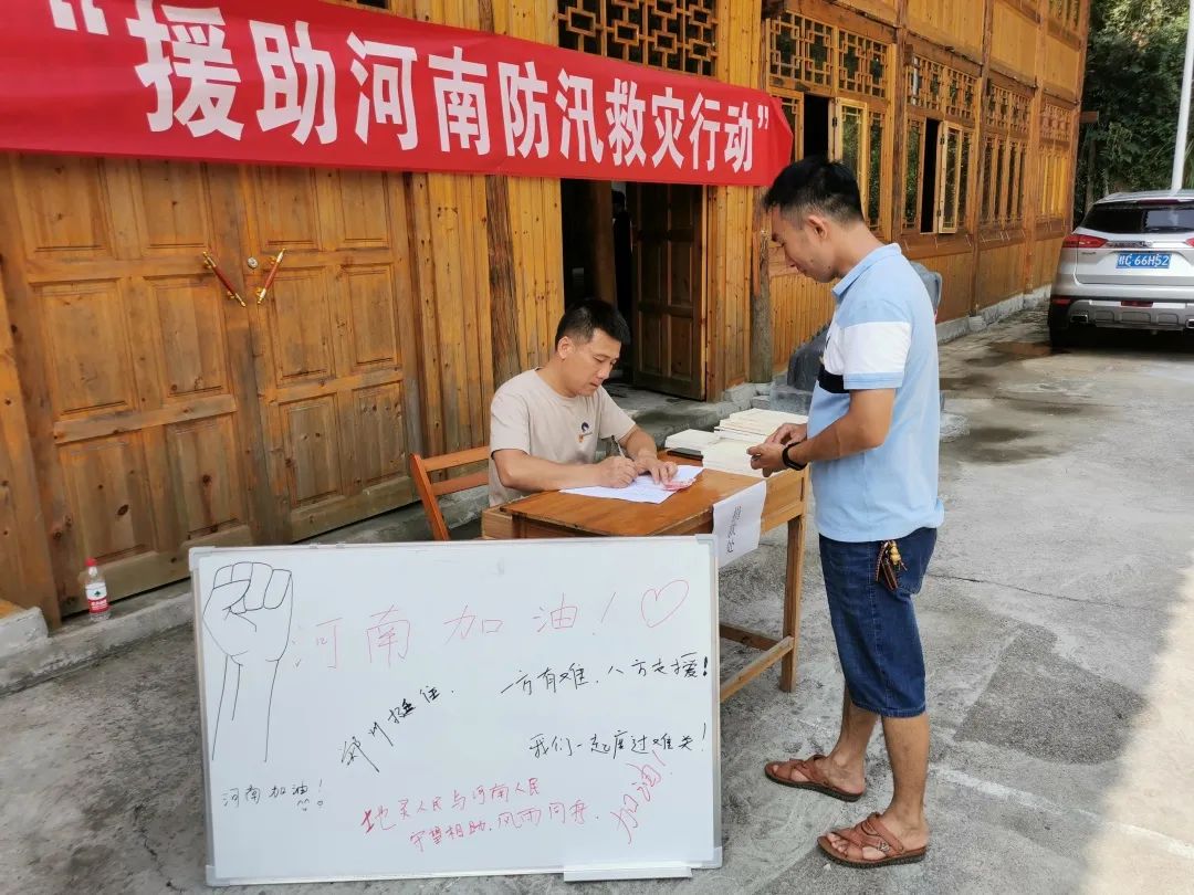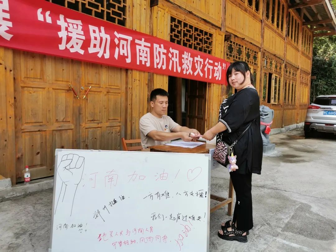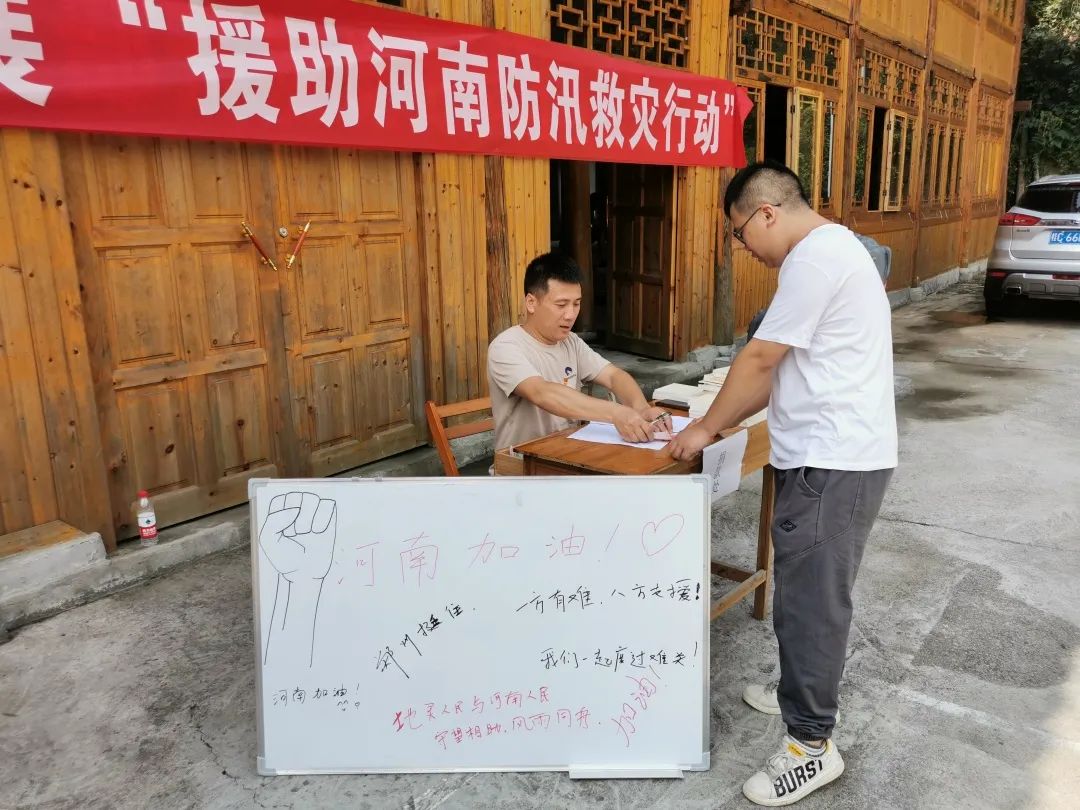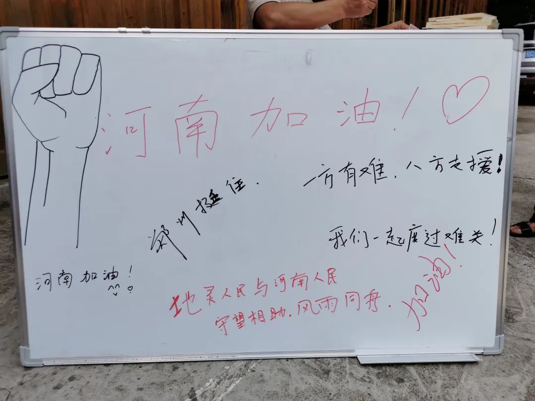 天灾无情人有情,在听完汤亚飞和吴广崇的讲述后,在场的所有人均表示地灵儿女与河南人民手足相亲、守望相助,危难之际更应风雨同担。大家充分发扬了“一方有难、八方支援”的大爱情怀,纷纷向受灾群众伸出援手,慷慨解囊,积极踊跃的进行爱心捐款。现场有捐20元的、有捐50元的、有捐100元的,大家都根据自己的实际情况,量力而行,捐赠现场的气氛好不热闹。最后,大家还自发的拿起了马克笔在宣传展板上写上了“河南加油”、“我们一起渡过难关”等祝福语,祝福河南等地群众早日恢复生产生活。