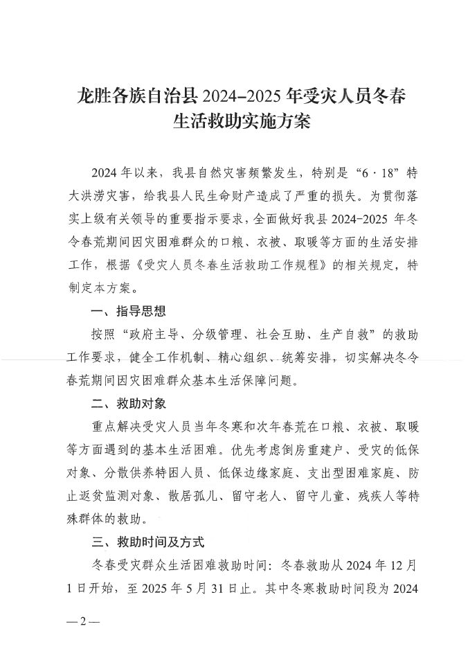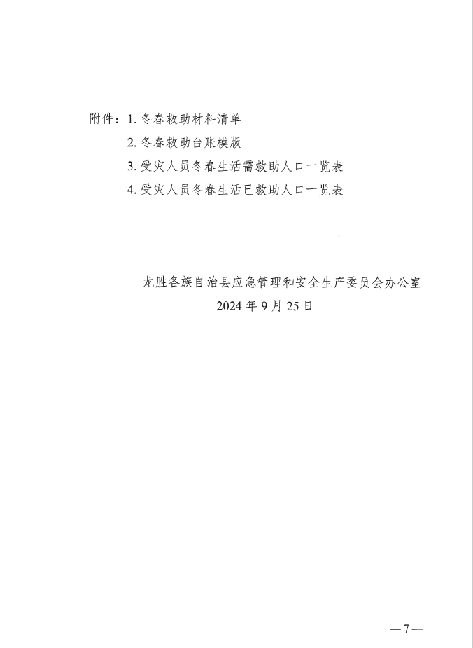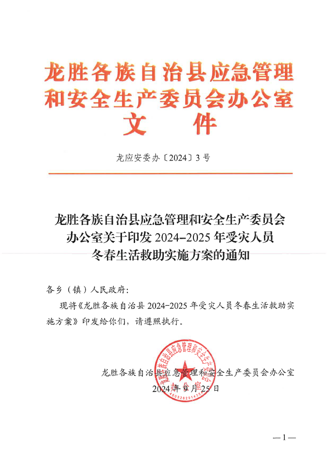 龙应安委办〔2024〕3号龙胜各族自治县应急管理和安全生产委员会办公室关于印发2024-2025年受灾人员冬春生活救助实施方案的通知