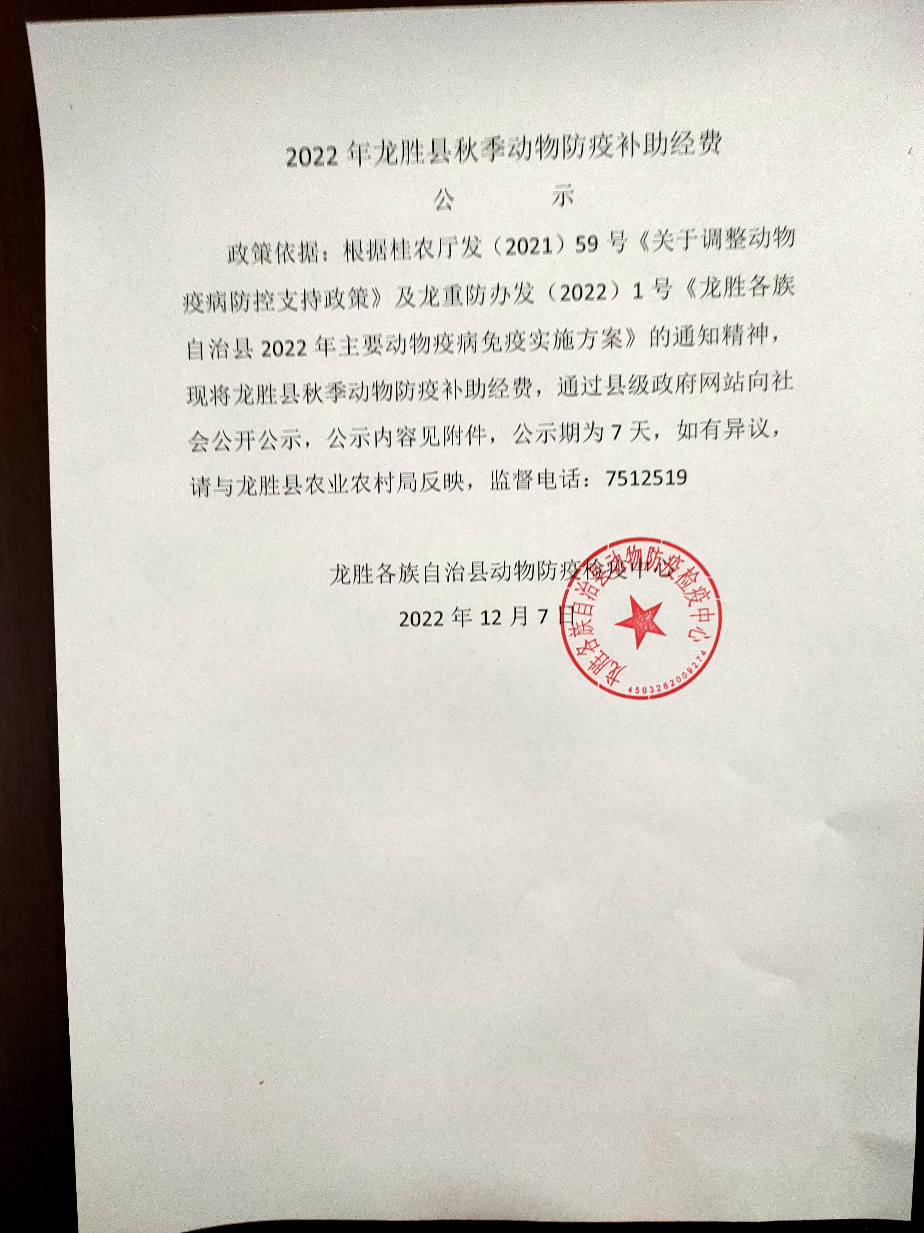 政策依据:根据桂农厅发〔2022〕59号《关于调整动物疫病防控支持政策》及龙重防办发〔2022〕1号《龙胜各族自治县2022年主要动物疫病免疫实施方案》的通知精神,现将龙胜县秋季动物防疫补助经费,通过县级政府网站向社会公开公示,公示内容见附件,公示期为7天,如有异议,请与龙胜各族自治县农业农村局反映,监督电话:7512519。