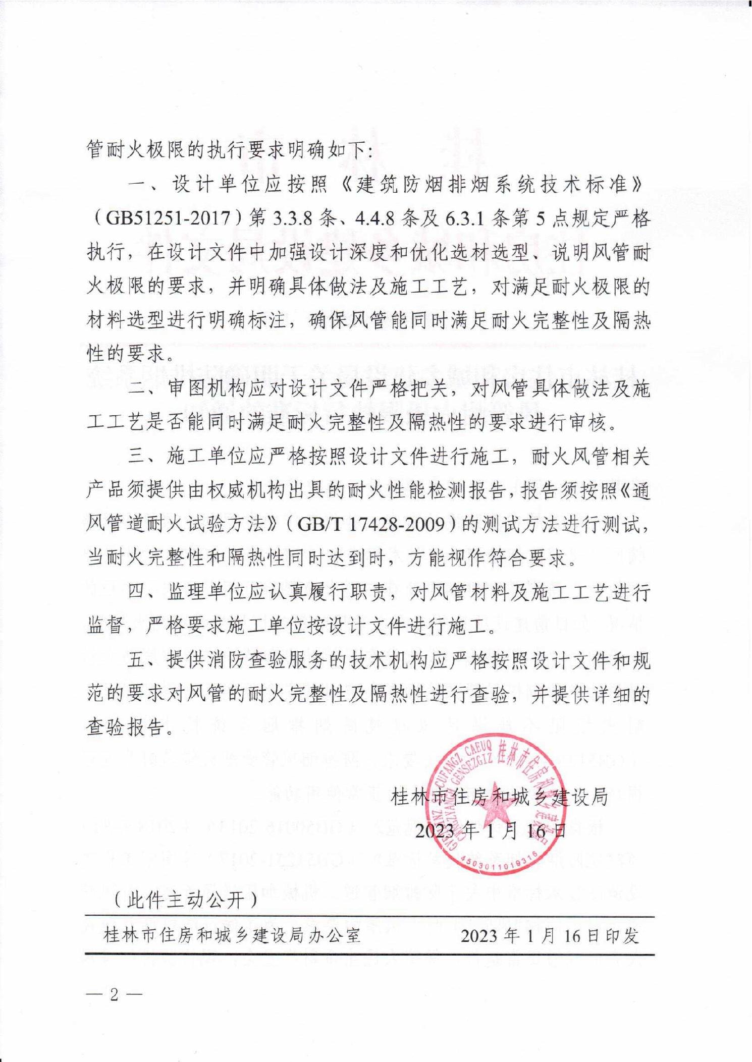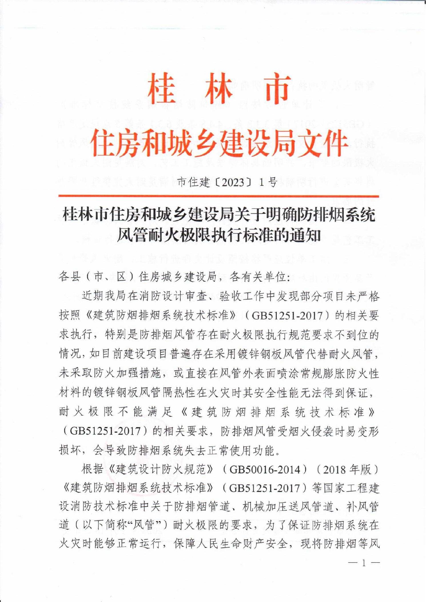 桂林市住房和城乡建设局关于明确防排烟系统风管耐火极限执行标准的通知