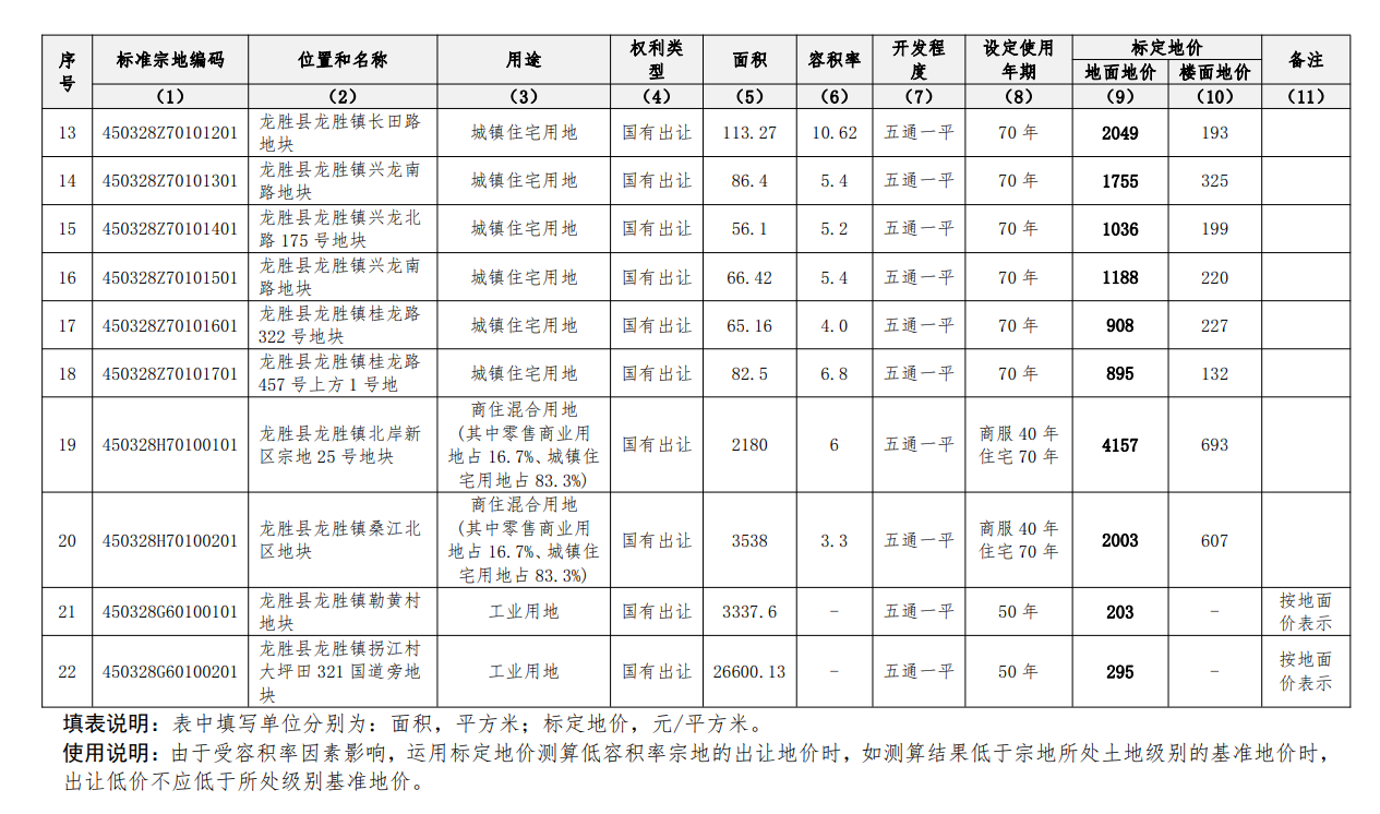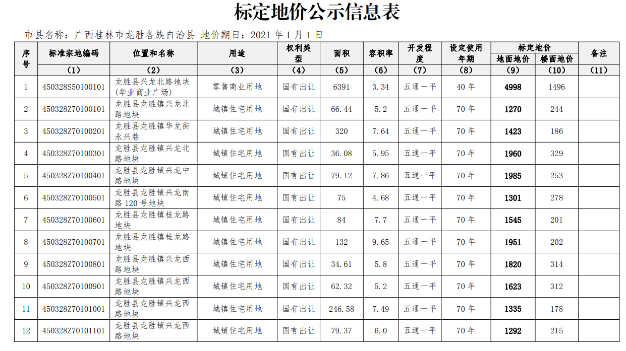 龙胜县标定地价信息