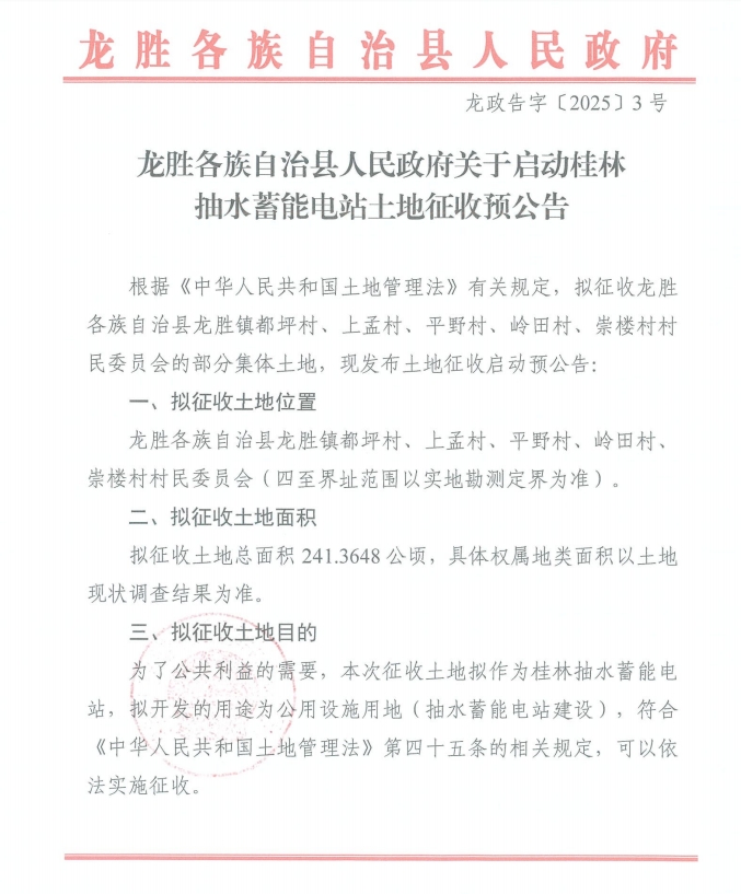 龙胜各族自治县人民政府关于启动桂林抽水蓄能电站土地征收预公告
