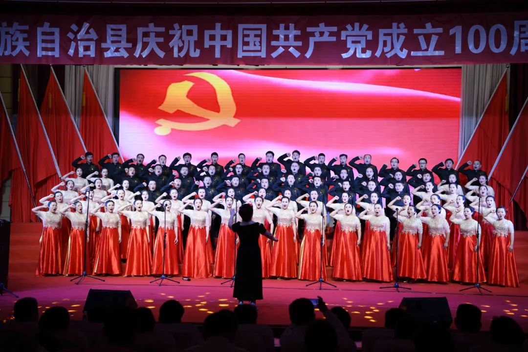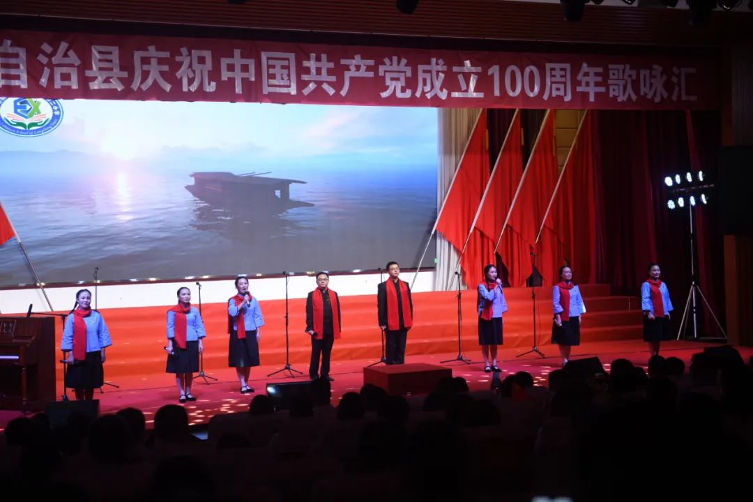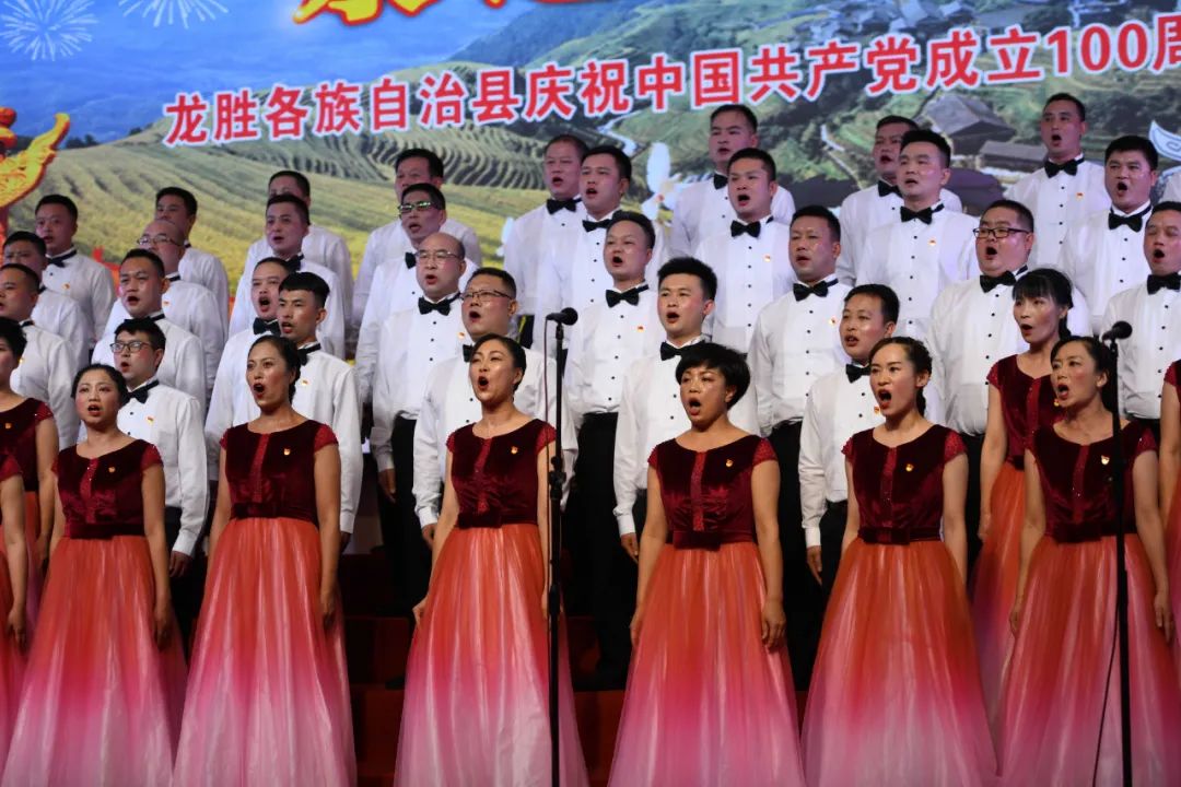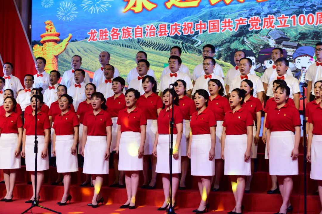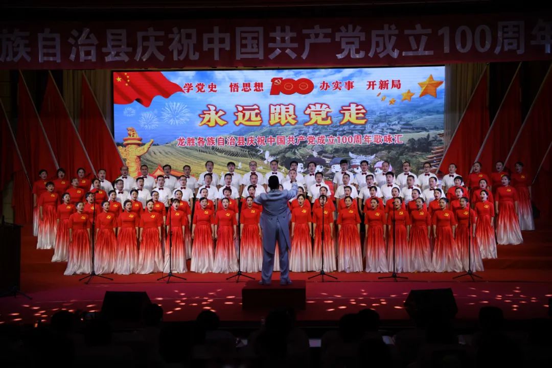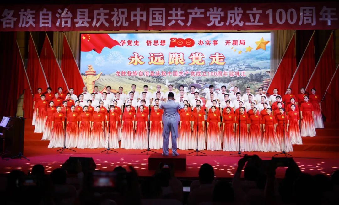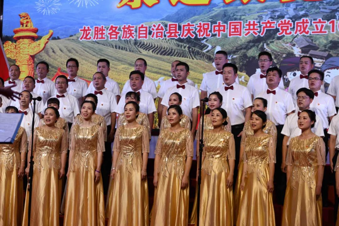 6月28日晚,龙胜各族自治县在县委党校会议中心举办庆祝中国共产党成立100周年歌咏汇。歌咏汇上的合唱队伍是在27日举行的全县歌咏比赛中精选出的优秀代表。县委主要负责人雷陈、自治县县长黄强、县人大常委会主任粟海英、县政协主席杨桂姬等在家的县四家班子领导与千余名干部群众在现场观看演出。