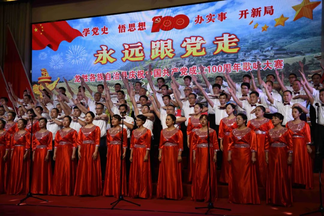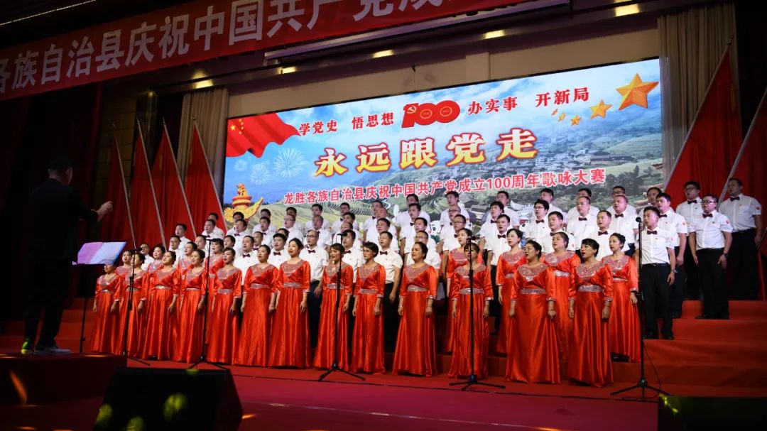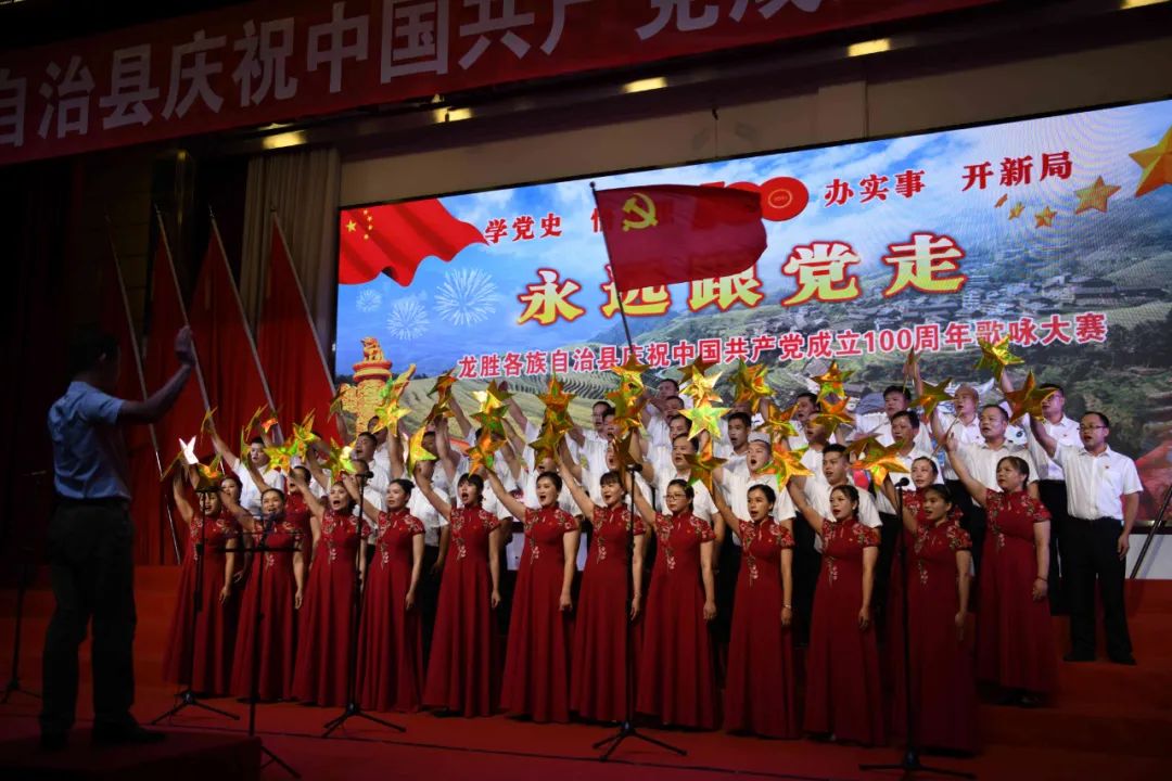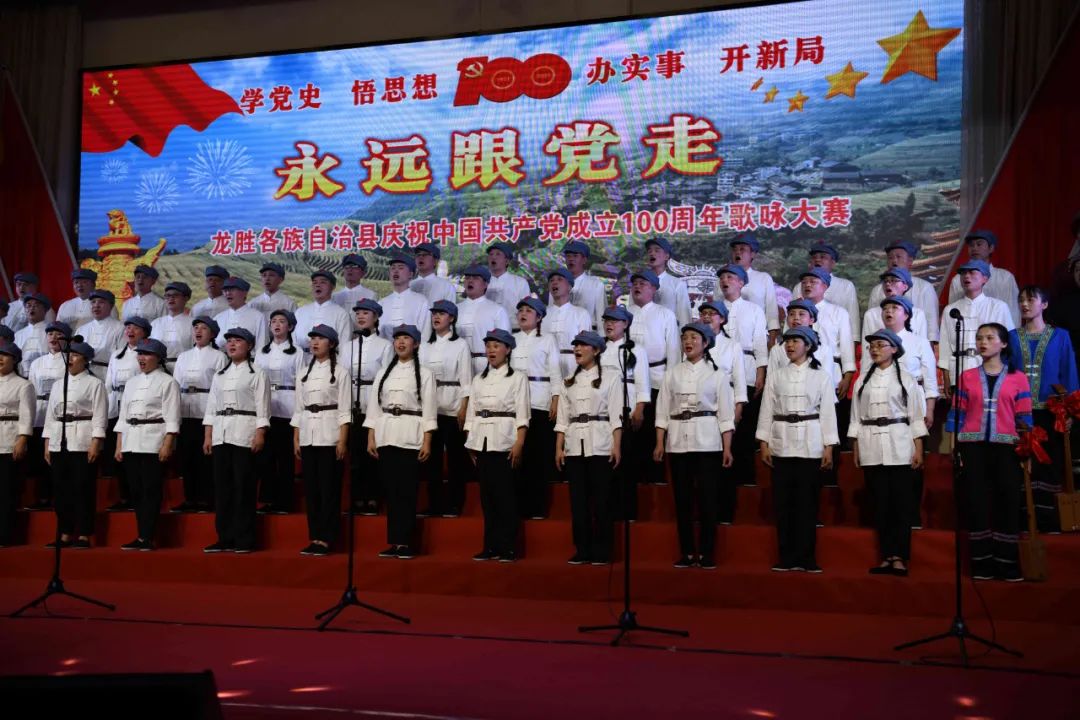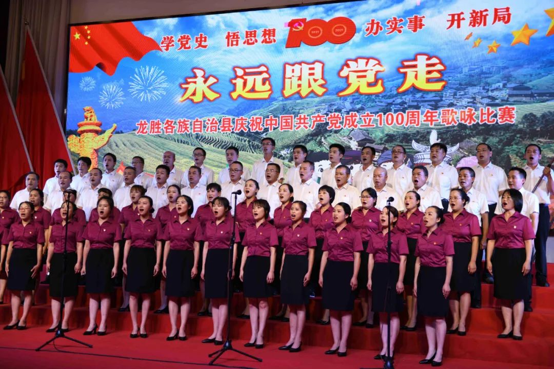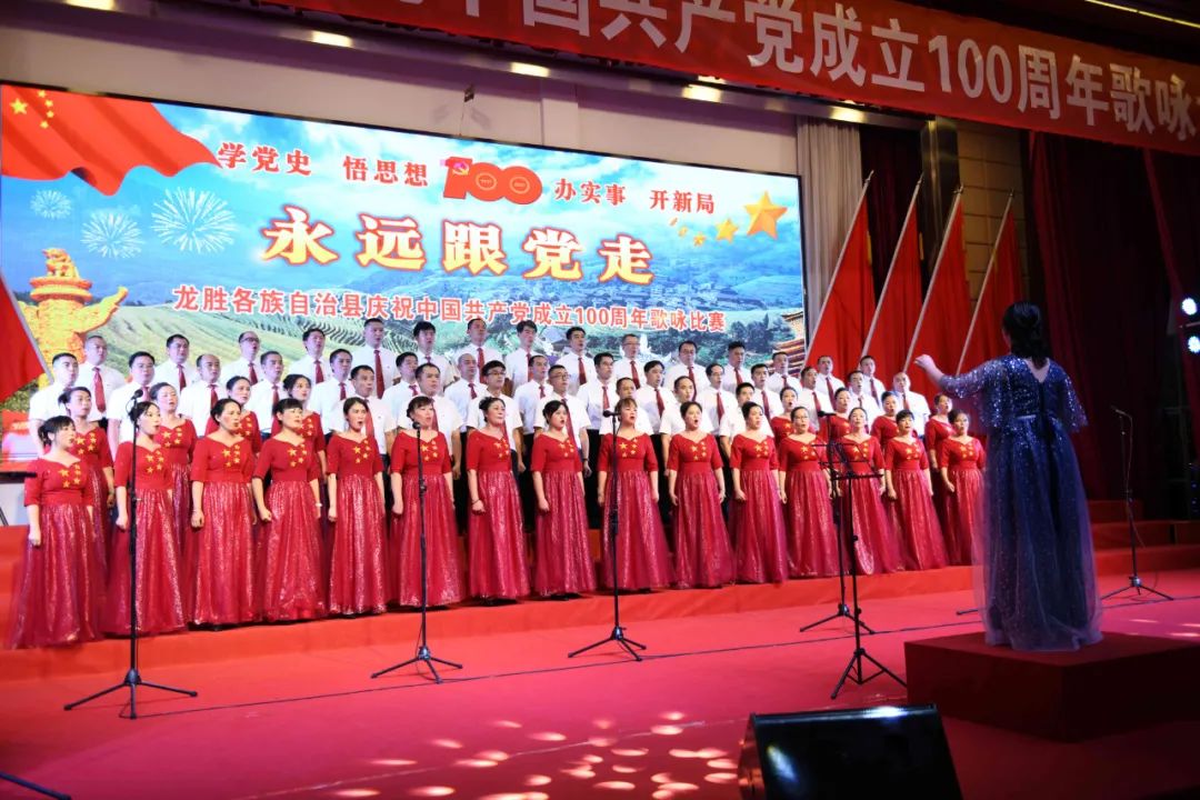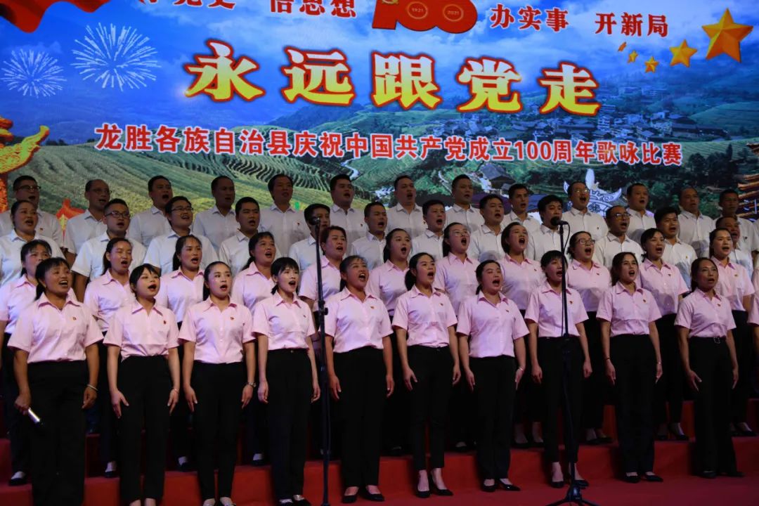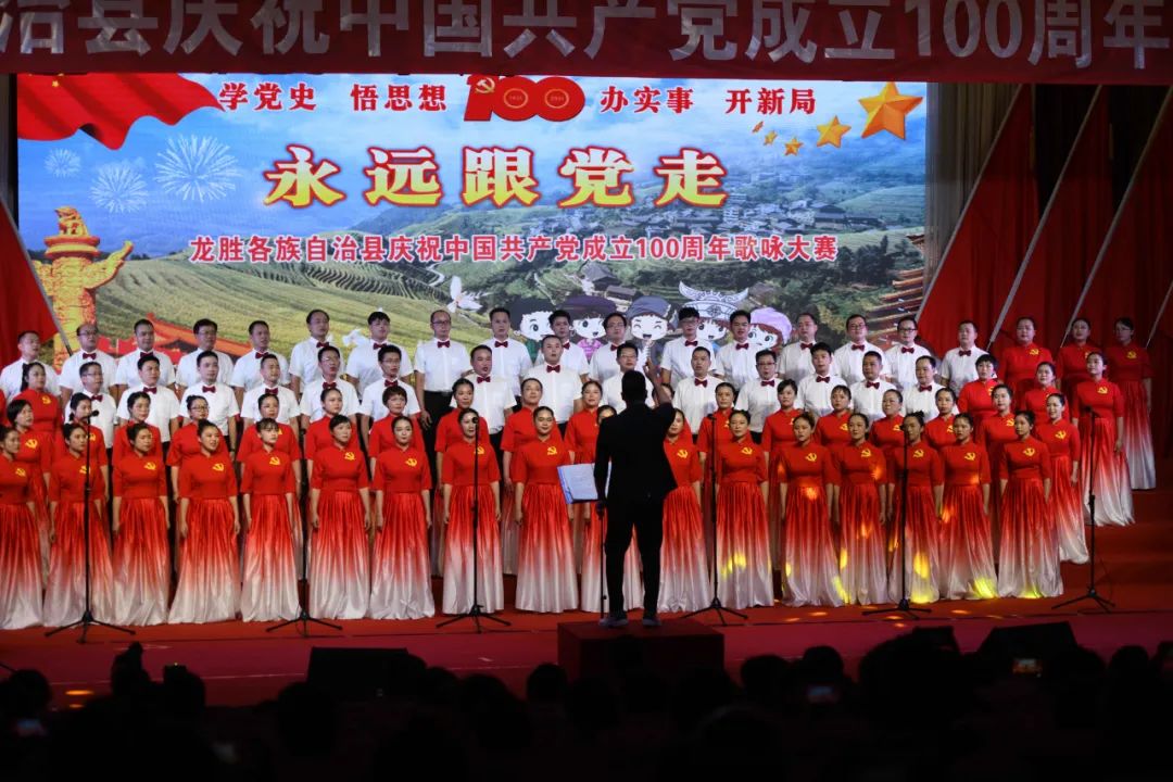 据悉,6月27日,我县举办庆祝中国共产党成立100周年歌咏比赛,来自县委办、县政府、各乡镇、县直各单位及企业等组成的40支合唱队参加比赛。在比赛中,各参赛队伍着装整齐,精神饱满,用嘹亮动听的歌声展示全县各条战线各民族领导干部良好的精神风貌,唱出了各族干部群众热爱中国共产党、热爱祖国、热爱龙胜的真挚感情,唱出了建设壮美广西、共圆复兴梦想的壮志豪情!