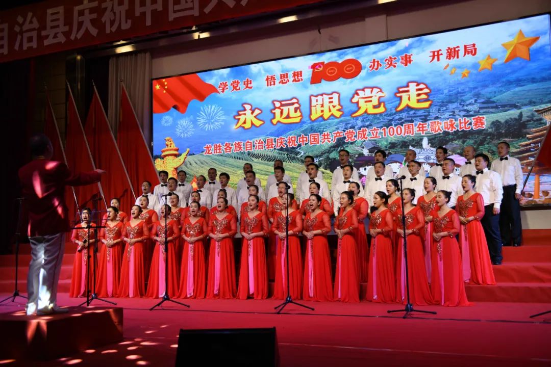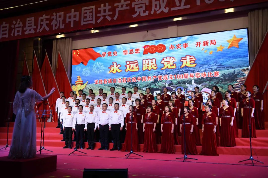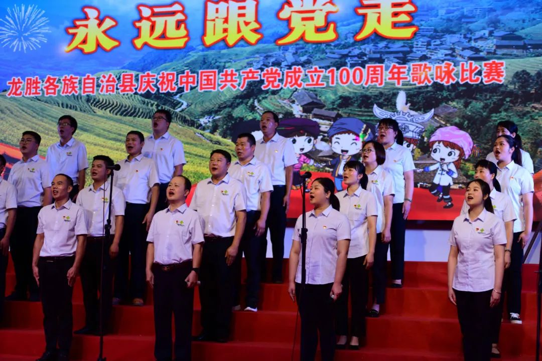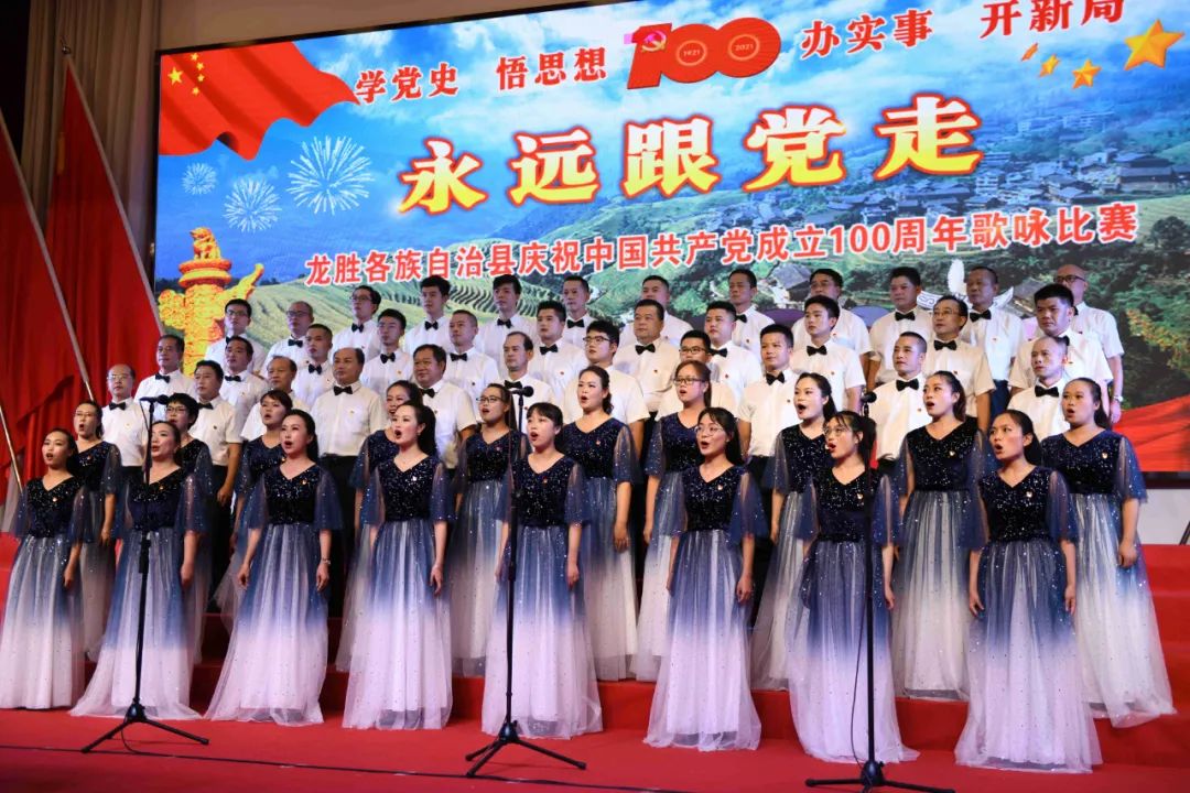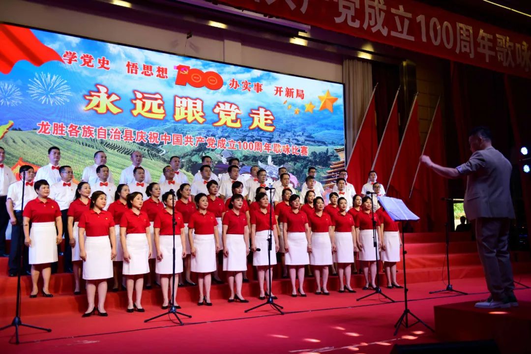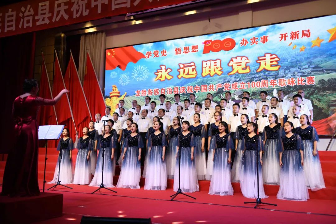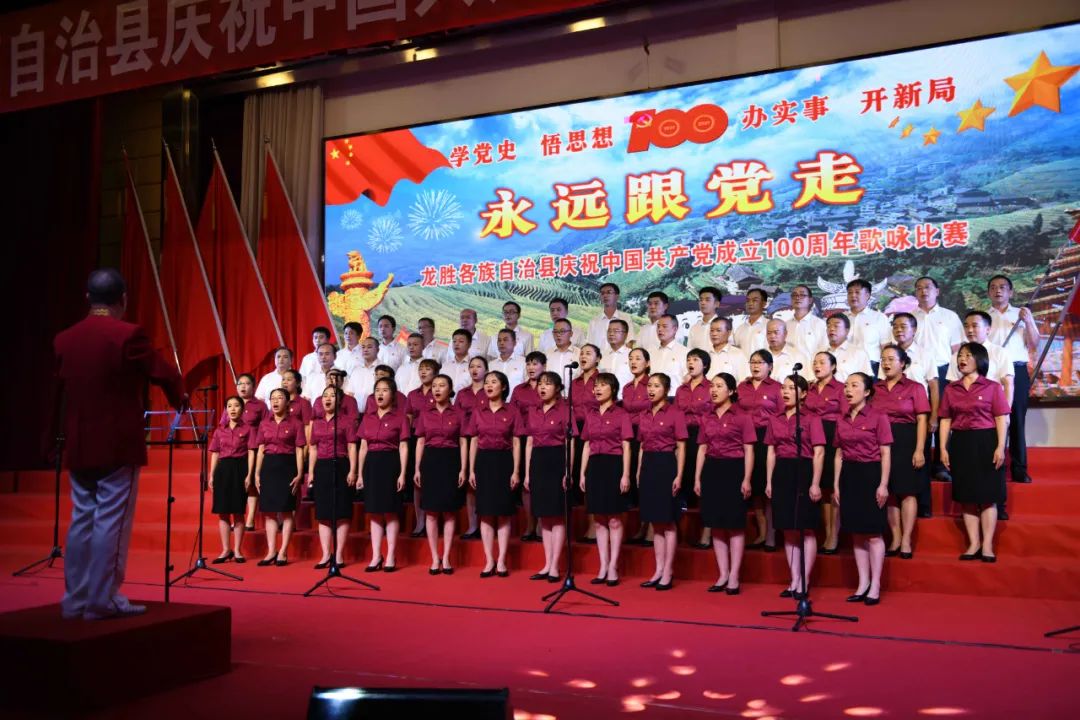 据悉,6月27日,我县举办庆祝中国共产党成立100周年歌咏比赛,来自县委办、县政府、各乡镇、县直各单位及企业等组成的40支合唱队参加比赛。在比赛中,各参赛队伍着装整齐,精神饱满,用嘹亮动听的歌声展示全县各条战线各民族领导干部良好的精神风貌,唱出了各族干部群众热爱中国共产党、热爱祖国、热爱龙胜的真挚感情,唱出了建设壮美广西、共圆复兴梦想的壮志豪情!