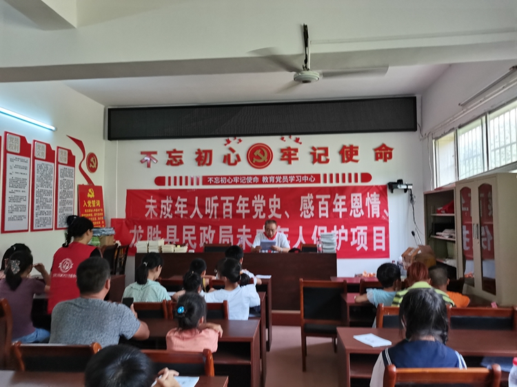 7月17日,龙胜县民政局未成年人保护项目工作组,桂林市七星区康乐社会工作服务中心的工作人员在龙胜县泗水乡龙甸村开展了一场别开生面的爱国主义教育宣讲活动。