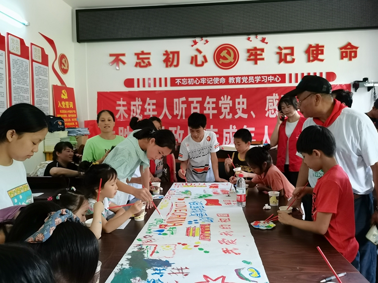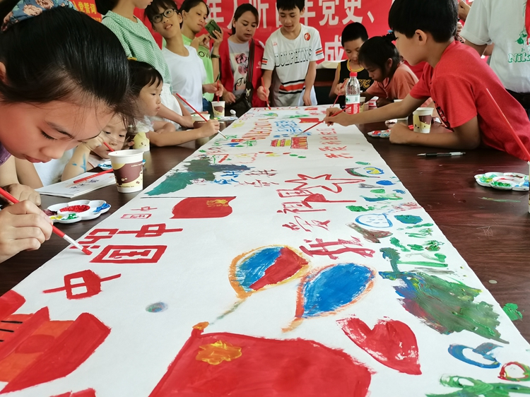 活动还准备了颜料和长卷,小朋友们在张爷爷的带领下,拿起画笔,在长卷上画下国旗,党徽,天安门,山河,我爱祖国等,并纷纷签上自己的名字,小小的长卷画不完孩子们对祖国的热爱和祝福,有了这颗红色的基因植入孩子们的内心,祖国的未来一定更美好。活动最后在《没有共产党就没有新中国》这首红歌中结束,孩子们手握自己的绘画作品,集合在一起,和家长们一起高唱着《没有共产党就没有新中国》,唱出了山区儿童对党的热爱,对未来幸福生活的信心。
